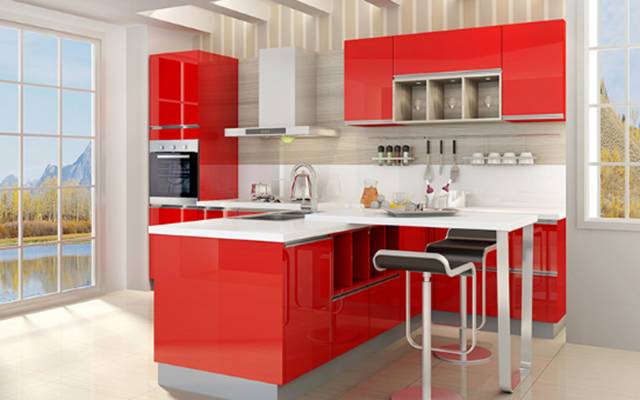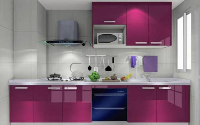 ▲ 一般來說,廚房都是女性使用得比較多,為了迎合大眾女性的口味,這款櫥柜門的顏色選用了玫瑰紅作為主色調(diào),不張揚(yáng)也不低調(diào),還含有一 種調(diào)皮的色彩,設(shè)計(jì)別有心裁。